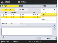 出力待ちのコピーがあるときに操作パネルの (ストップ)を押すと、すべてのコピーが一時中断され、<<ストップ>中止するコピージョブを選択します。>というメッセージとコピーの一覧が表示されます。この画面でコピーを1つ選び、<中止>を押してコピーを中止することもできます。出力待ちのコピーを続けるときは、<コピー再開>を押してください。 |