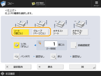 仕上げ機能によってはオプションが必要です。オプション機器について 用紙の種類によっては、仕上げ機能を使用できません。機器仕様 原稿台ガラスに原稿をセットしているときコピーの基本画面で<その他の機能> <連続読込>を押すことで、原稿台ガラスに原稿をセットしてもソート/グループ機能を使用できます。グループ出力時にページごとに仕切紙を挿入する<グループ (ページごと)>で出力した場合、ページごとに仕切紙を挿入することができます。設定方法について詳しくは、<グループ間仕切紙>を参照してください。<グループ間仕切紙> <保存ファイルの利用>機能から設定するときボックスに保存したファイルとPDF/XPSファイルをプリントするときのみ、仕上げ機能を利用できます。 |