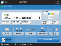 倍率、コピーする用紙、部数などの設定状況が表示されます。正しくコピーするために、必ずここの設定内容を確認してください。設定を変更するときは、表示部の下にあるボタンを押します。