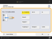 2 | Select the type of envelopes. ![]() To register a custom size envelope, press <Custom> <Next> and press <X> or <Y> to specify the side, then use the numeric keys to enter the length of the specified side.Press <OK> and proceed to step 5. |