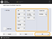 2 | Select the type of envelopes. ![]() To register a custom size envelope, press <Custom> <Next> and press <X> or <Y> to specify the side, then use the numeric keys to enter the length of the specified side. |