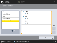The destinations that can be specified when sending scanned documents can be restricted to those registered in the Address Book or one-touch buttons, those registered in <Favorite Settings> or <Send to Myself>, or those that can be searched on the LDAP server. When this function is enabled, users cannot specify destinations using alphanumeric character input.
