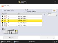 You can load custom size paper if both of the paper sides are between 7 1/8" (182 mm) and 19 1/4" (487.7 mm) in length, and between 5 1/2" (139.7 mm) and 13" (330.2 mm) in width. You cannot load custom size paper if either one of the sides is smaller or larger than the paper sizes that can be loaded. If a message prompting you to load paper appears during printing, the remaining prints are automatically made after you load the correct paper. If you select a different paper source, the remaining prints are made after you press <OK>. To cancel printing, press <Cancel>. When changing the paper to load into the "Multi-drawer Paper Deck-E" from plain paper to coated paper, you may wait a moment because temperature control of the warm air which fans a paper is required. Check the Specialty Media Handling Guide and make appropriate settings for the paper to be loaded into the "Multi-drawer Paper Deck-E." |