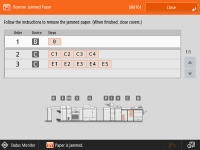 Paper may not actually be jammed in the location you check. Even in this case, follow the instructions on the screen to check all the locations. The screen indicating that there is a paper jam is repeatedly displayed until you clear the paper jam. If you press <Close> on the screen indicating that there is a paper jam, you may be able to continue to perform operations and specify settings without immediately removing the paper jam. Do not remove paper from a location other than that displayed as a paper jam location on the screen. This may cause paper jams in other locations or missing pages in output documents. |