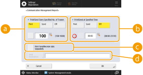 You cannot configure the settings for the Communication Management Report while <Display Job Log> in <Management Settings> is set to <Off>. In addition, if you change <Display Job Log> in <Management Settings> from <Off> to <On>, <Print/Send Every Specified No. of Transm.> and <Print/Send at Specified Time> in the Communication Management Report automatically changes to <Off>. <Display Job Log> |