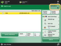To select a destination from the <One-Touch> screen after scanning, set <One-Touch> for <Default Screen>. The work required for sending scanned documents to the same destination can be reduced. <Default Screen>The destinations registered in the one-touch buttons of the server machine are updated in the following times: When a fax job has been sent on the client machine When you press  (Reset) on the client machine When Auto Reset is activated on the client machine |