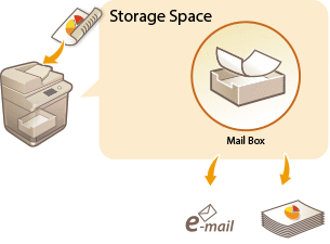 By scanning and saving documents in a temporary storage space, "Mail Box," you can make simple edits to files, such as combining files and deleting pages from files. As the Mail Box does not require any special settings, you can get started using it quickly and easily. Once files are edited, you can handle them according to your purposes, such as printing and sending files to a computer via e-mail.