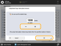 Automatic adjustment will not be carried out for any jobs you start by interrupting the job in progress. Such jobs may not start in the interruption time intervals you set. Keep in mind that the interval setting is merely an estimate. The interruption correction function reduces the fluctuations within jobs with large numbers of sheets. If you wish to prioritize accuracy by adjusting the interruption intervals, increase the interruption frequency. However, that will also require more adjustment pages and therefore decrease productivity. The adjustment may not be as effective for jobs where multiple types of paper are used simultaneously. When you start a job with automatic color adjustment, a standard test page is printed before the specified interruption interval in order to carry out the adjustment process. |