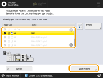 Before making adjustments, clean the scanning areas on the platen glass and in the feeder. Cleaning the Feeder Use the following conditions to print out the test page. Accurate adjustment results may not be obtained If the test page is not printed appropriately. Paper size: 100 mm x 148 mm to 297 mm x 1,000 mm Finish: Uncoated, Recycled, Cotton Type: Normal, Letterhead Basis Weight: 52 to 220 g/m2 If you print the test page on paper of a different size than the designated paper size, the image position may not be adjusted properly. If an edge of the test page is cut incorrectly or folded, or the image is not correctly printed on the test page, the message <Correctly place the test page on the platen glass.> may appear during the scanning process. Adjustment may not be performed correctly with some types of paper, such as textured paper with rough surface or colored paper. If adjustment is not performed correctly when <Use Scanner> is selected, select <Do Not Use Scanner> instead. In the following cases, the test page cannot be scanned properly and the adjustment cannot be performed: The test page is skewed when being scanned The paper size is like EXEC or G-LGL, which can be skewed while scanning because the paper guide cannot be fixed. |