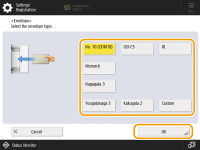 2 | Select the type of envelopes. ![]() To register a custom size envelope, press <Custom> <Next> and press <X> or <Y> to specify the side, then use the numeric keys to enter the length of the specified side. |