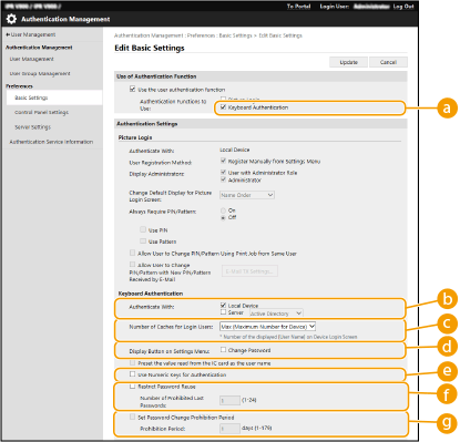 Whenever Picture Login is activated, the authentication device for keyboard authentication is fixed to [Local Device]. If you want to log in with a user account that is registered in an authentication server, disable Picture Login.