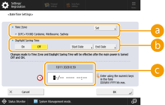 If you changed the setting of <Time Zone> or <Daylight Saving Time>, you need to restart the machine by turning the power OFF. Press the power switch to turn OFF the machine ( Turning OFF the Machine). When 10 or more seconds have elapsed after the main power indicator turned off, turn ON the machine again ( Turning ON the Machine). |