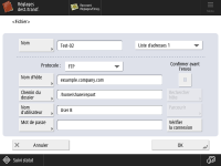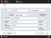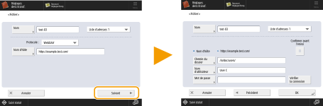 ![]() Pour toute information sur le serveur de fichiers, adressez-vous à votre administrateur réseau. Il est possible d'utiliser 128 caractères alphanumériques pour <Nom d'hôte> sur le panneau de commande. Il est possible d'utiliser 255 caractères alphanumériques pour <Chemin du dossier>. Définir les réglages du serveur en fonction du nombre maximal de caractères. <Nom d'hôte>Saisissez le nom d'hôte du serveur de fichiers. ![]() Lorsque <Windows (SMB)> est sélectionné Si vous sélectionnez <Windows (SMB)>, les boutons <Rechercher hôte> et <Parcourir> s'affichent. Vous pouvez facilement spécifier un serveur de fichiers en parcourant le réseau ou en y faisant une recherche. <Parcourir> est disponible uniquement lorsque <1.0> dans <Spécifier version client SMB> est réglé sur <Oui>. Lorsque vous sélectionnez <Répertoire> dans la liste déroulante sur l'écran <Parcourir>, vous pouvez sélectionner à partir des noms de domaine du serveur Active Directory enregistré sur l'appareil. Vous pouvez enregistrer jusqu'à cinq serveurs Directory. Quand <WebDAV> est sélectionné Après avoir saisi le nom d'hôte, appuyez sur <Suivant>. <Chemin du dossier>Spécifiez le répertoire du dossier dans lequel les données sont envoyées. ![]() Lorsque <Windows (SMB)> est sélectionné pour le protocole, <Vérifier la connexion> ne peut vérifier que jusqu'au premier niveau du chemin de dossier spécifié. <Nom d'utilisateur>Saisissez le nom d'utilisateur de connexion au serveur de fichiers. <Mot de passe>Saisissez le mot de passe de connexion au serveur de fichiers. ![]() Si vous définissez en tant que destinataire de transfert celui pour lequel vous activez <Confirmer avant l'envoi>, l'écran de saisie du mot de passe n'apparaît pas. Le mot de passe enregistré est utilisé et le transfert s'effectue. <Dossier de tri>Si <Dossier de tri> est activé, lorsque vous numérisez et envoyez un document, vous pouvez créer un nouveau dossier dans le dossier de destination spécifié dans <Chemin du dossier> et stocker le document numérisé dans le nouveau dossier. Création d'un autre dossier dans un dossier de destination avant la numérisation | ||||||||||||