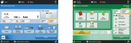 Vous pouvez modifier les boutons de réglage affichés sur l'écran des fonctions de base (pour la copie et la numérisation). Vous pouvez aussi afficher un écran Fonctions de base différent, personnalisé pour chaque utilisateur connecté.