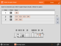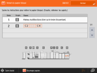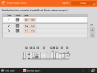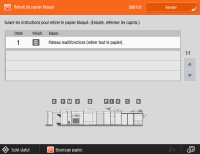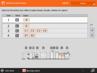 Les tableaux suivants montrent des écrans de bourrage papier typiques et des emplacements de bourrage papier (image) lors de l'utilisation de feuilles de 1 300 mm de long, ainsi que des références aux procédures en fonction de ceux-ci. Les emplacements des bourrages papier peuvent différer légèrement pour des raisons telles que la longueur du papier et le moment du bourrage papier. |