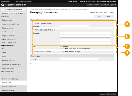 La fenêtre contextuelle s'affiche si vous n'exécutez aucune opération pendant un certain laps de temps ou bien si vous redémarrez l'appareil. Utilisez cette fonction, par exemple, pour les messages indiquant un entretien planifié.