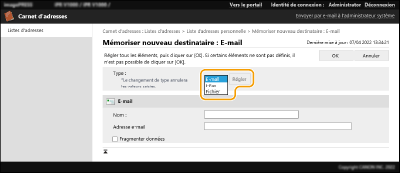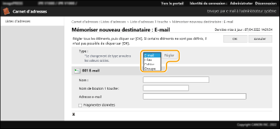 [Liste d'adresses pour administrateurs] n'est disponible que pour les administrateurs qui se connectent avec les privilèges Administrateur ou DeviceAdmin.