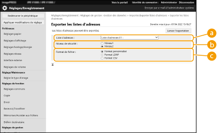3 | Configurez les réglages nécessaires. ![]() [Listes d'adresses]Sélectionnez les listes d'adresse à exporter. Notez qu'après avoir sauvegardé les listes d'adresses, les valeurs d'usine des noms des listes d'adresses sont rétablies. [Niveau de sécurité]Vous pouvez définir le niveau de sécurité si [Format personnalisé] est sélectionné dans [Format de fichier]. Quand [Niveau 1] est sélectionné, vous pouvez importer vers toutes les imprimantes multifonctions Canon. Quand [Niveau 2] est sélectionné, le mot de passe pour les données de la liste d'adresse est crypté à l'aide d'une méthode plus sécurisée que [Niveau 1]. Toutefois, les données ne peuvent être importées que dans les modèles de l'appareil compatibles avec le réglage [Niveau 2] (modèles sur lesquels le réglage [Niveau de sécurité] s'affiche). [Format de fichier]Sélectionnez le format de fichier des données à exporter. Sélectionnez [Format personnalisé] quand vous avez l'intention d'importer toutes les informations enregistrées dans les listes d'adresses vers une autre imprimante multifonctions Canon ou sélectionnez [Format LDAP] ou bien [Format CSV] si le fichier doit être utilisé par une application d'ordinateur. Notez toutefois que si [Format LDAP] est sélectionné, seules les adresses e-mail sont sauvegardées. ![]() Pour définir un mot de passe pour les données exportées Définissez <Inclure mot de passe pr exporter carnet adr.> sur <Oui> (<Inclure mot de passe pr exporter carnet adr.>). Lorsque ce réglage est effectué, les éléments de saisie du mot de passe s'affichent dans l'écran [Exporter les listes d'adresses]. Si un mot de passe a été défini, les données ne peuvent être importées que si le mot de passe correct est saisi. Pour modifier des données exportées au format CSV Pour en savoir plus sur chaque colonne dans le carnet d'adresses, consultez la section Éléments du carnet d'adresses. Il est possible que les données ne soient pas correctement importées lorsque vous les importez sur un appareil de version plus ancienne. |