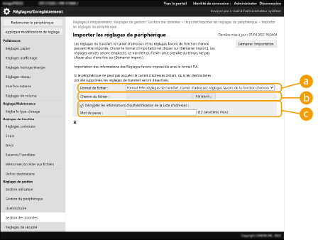 3 | Configurez les réglages nécessaires. ![]() Le carnet d'adresses actuel est supprimé et écrasé par les informations du carnet d'adresses importé. Lors de l'importation, aucune opération ne peut être exécutée sur l'interface utilisateur distante jusqu'à ce que la machine redémarre. En outre, les réglages importés deviennent valides après avoir redémarré l'appareil. Mise hors tension/redémarrage de l'appareil ![]() [Format de fichier]Sélectionnez le format de fichier des données de réglage à importer. Notez que le format de fichier varie en fonction du modèle d'imprimante multifonctions qui a exporté les données. Vérifiez le fichier à importer. [Chemin du fichier]Cliquez sur [Parcourir...], et sélectionnez le fichier à importer. [Décrypter les informations d'authentification de la Liste d'adresses]Lors de l'import de fichiers cryptés, cochez la case et saisissez le même mot de passe que celui qui a été saisi quand les données de réglage ont été exportées. |