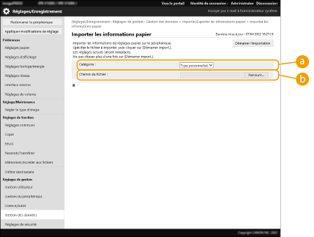 3 | Configurez les réglages nécessaires. ![]() [Catégorie]Sélectionnez les informations de réglage de papier. [Chemin du fichier]Cliquez sur [Parcourir...], et sélectionnez le fichier à importer. |