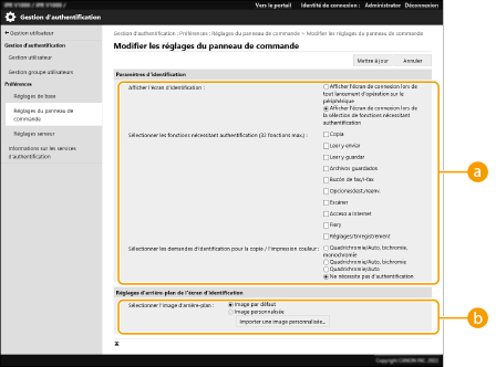 [Paramètres d'identification]Dans [Afficher l'écran d'identification :], sélectionnez quand l'écran de connexion s'affiche.