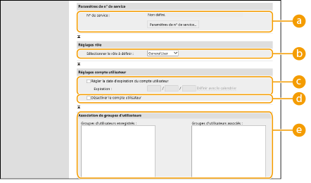 [N° de service :]Si vous utilisez la gestion des numéros de service, vous devez cliquer sur [Paramètres de n° de service...] et sélectionner le numéro de service à attribuer à l'utilisateur. Enregistrez d'abord les numéros de service nécessaires dans [Mémoriser nouveau service...] sur l'écran de liste. Si le numéro de service que vous spécifiez ici est par la suite supprimé, n'oubliez pas de changer ce réglage.