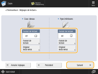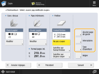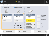 3 | Spécifier les réglages détaillés pour les intercalaires appuyer sur <OK>.Pour sélectionner le papier des intercalaires, appuyer sur <Modifier> sous <Choisir papier> sélectionner l'alimentation papier appuyer sur <OK>.![]() Si on sélectionne un format papier différent pour la page de garde de dessus, la page de garde de dessous ou les intercalaires, les formats papier des autres fonctions sont automatiquement modifiés en fonction du nouveau format. Toutefois, si on se contente de modifier l'alimentation papier d'une fonction pour le même format papier, les réglages des autres fonctions ne sont pas modifiés. Avant d'alimenter le papier à partir de l'"Unité d'insertion de Document-R", charger le papier dans l'"Unité d'insertion de Document-R" et spécifier le format papier. ![]() Il est possible d'insérer jusqu'à 100 intercalaires. |