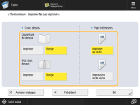 2 | Sélectionner les réglages de copie sous <Page de garde avant> et <Page de garde arrière> appuyer sur <OK>.Sélectionner <Vierge> pour ne pas copier sur la page de garde. Si le papier de la page de garde est prélevé de l' "Unité d'insertion de Document-R", sélectionner <Vierge>. Pour définir le papier à utiliser pour la page de garde, appuyer sur <Modifier> pour <Choisir papier> sélectionner l'alimentation papier appuyer sur <OK>. |