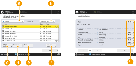 Lorsque l'on mémorise les réglages du type de papier personnalisé, veiller à modifier son nom. Il est impossible de modifier les réglages des types de papier par défaut enregistrés sur la machine. |
