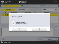 Schermate che portano a <Lavori invio>/<Lavori stampa> Schermata <Home> Schermate principali di <Monitoraggio stato> (<Lavoro>, <Carta>, <Toner/Altro>) Schermata <Impostazioni di Visual Message> Se si preme (Stop) sul pannello comandi durante l'elaborazione di un lavoro di invio e viene visualizzata la schermata <Scansione e invio>, viene visualizzata una schermata a comparsa che annulla direttamente il lavoro in corso. Se sono in elaborazione più lavori, è possibile determinare quale lavoro annullare: l'ultimo o quello in corso di invio. (<Lavoro da annullare alla pressione di Stop>)Se è presente un lavoro avviato dopo aver premuto (Stop) sul pannello comandi, il lavoro viene eseguito.Per istruzioni su come annullare lavori di stampa dalla schermata <Copia>, vedere Annullamento della copia. |