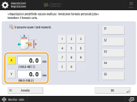 Premere <X> o <Y> per inserire la lunghezza di ciascun lato usando i tasti numerici. ![]() Se si registra il formato carta usato frequentemente sui pulsanti da <S1> a <S5>, è possibile richiamarlo tramite la pressione di un solo tasto. Registrazione della carta di formato libero (carta di formato personalizzato) | |