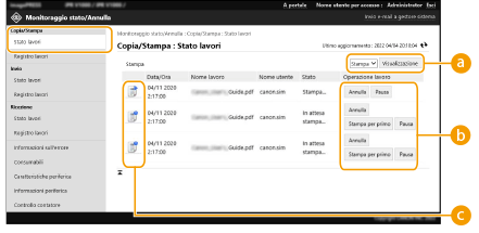 È possibile usare la IU remota per verificare lo stato di documenti in attesa di elaborazione, nonché i registri dei documenti che sono stati elaborati. È possibile verificare anche lo stato della macchina, per esempio le informazioni di errore e la quantità rimanente di materiali di consumo.