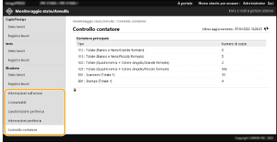 È possibile verificare un gran numero di informazioni sulla macchina, ad esempio informazioni sugli errori, quantità di carta e toner rimanenti, informazioni sulle apparecchiature opzionali collegate e numero totale di pagine che sono state stampate finora.
