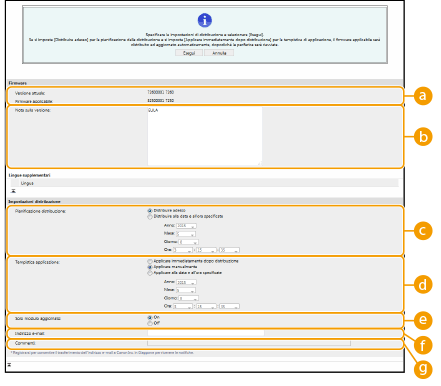 [Pianificazione distribuzione]Per scaricare il firmware immediatamente, selezionare [Distribuire adesso]. Per scaricare automaticamente il firmware in data e orario specifici, selezionare [Distribuisci in data e orario specifici] e specificare la data e l'orario in [Anno]/[Mese]/[Giorno]/[Ora]. È possibile programmare il momento con una settimana di anticipo.