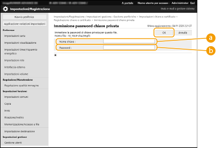 2 | Inserire il nome del codice e la password quindi fare clic su [OK]. [Nome chiave]Utilizzare caratteri alfanumerici per immettere il nome del codice che è stato registrato nella macchina. [Password]Utilizzare caratteri alfanumerici per immettere la password del codice privato impostato per la registrazione del file. |
