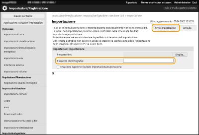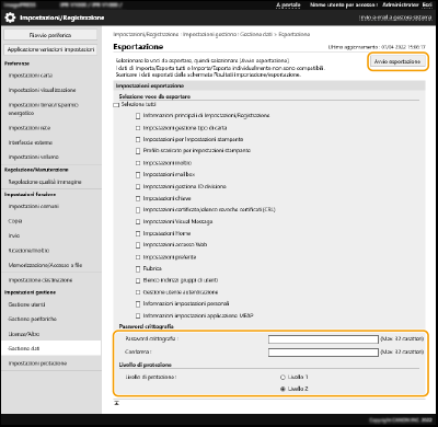 Viene richiesta la password in [Password crittografia] ogni volta che vengono importati i dati di impostazione esportati. Utilizzare caratteri alfanumerici.
