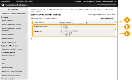3 | Configurare le impostazioni necessarie. ![]() [Elenchi indirizzi]Selezionare l'elenco indirizzi da esportare. Si noti che quando gli elenchi di indirizzi sono stati salvati, i nomi degli elenchi di indirizzi riacquisiscono le impostazioni di fabbrica predefinite. [Livello di protezione]È possibile impostare il livello di sicurezza se è selezionata l'opzione [Formato personalizzato] in [Formato file]. Quando è selezionata l'opzione [Livello 1], si può eseguire l'importazione in tutte le stampanti multifunzione Canon. Quando è selezionata l'opzione [Livello 2], la password dei dati elenchi indirizzi è stata cifrata utilizzando un metodo più specifico rispetto a [Livello 1]. Tuttavia, è possibile importare i dati solo nei modelli di macchina che supportano le impostazioni [Livello 2] (modelli dove sono visualizzate le impostazioni [Livello di protezione]). [Formato file]Selezionare il formato di file dei dati da esportare. Selezionare [Formato personalizzato] quando si desidera importare tutte le informazioni registrate negli elenchi indirizzi in un'altra stampante multifunzione Canon, oppure selezionare [Formato LDAP] o [Formato CSV] se il file deve essere utilizzato da un'applicazione del computer. Si noti tuttavia che, quando è selezionata l'opzione [Formato LDAP], vengono memorizzati solo gli indirizzi e-mail. ![]() Per impostare una password per i dati esportati Impostare <Includere password quando si esporta rubrica> su <On> (<Includere password quando si esporta rubrica>). Quando è configurata questa impostazione, appaiono le voci per l'inserimento della password sulla schermata [Esportazione elenchi indirizzi]. Se è stata impostata una password, i dati possono essere importati soltanto in caso di inserimento della password corretta. Per modificare i dati esportati in formato CSV Per informazioni su ciascuna colonna della Rubrica, vedere Voci della Rubrica. Potrebbe non essere possibile importare correttamente i dati quando si importa in una versione obsoleta della macchina. |