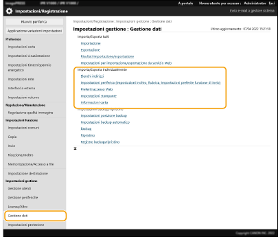 1 | Fare clic su [Impostazioni periferica (Impostazioni inoltro, Rubrica, Impostazioni preferite funzione di invio)] in [Importa/Esporta individualmente]. |