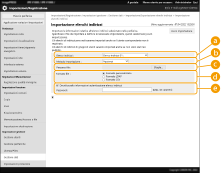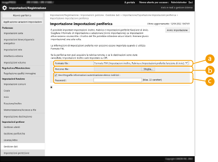 3 | Configurare le impostazioni necessarie. ![]() La Rubrica corrente viene eliminata e sovrascritta con le informazioni sulla Rubrica importata. Durante l'importazione non è possibile eseguire operazioni sulla IU remota prima dell'avvio della macchina. Inoltre le impostazioni importate acquisiscono validità dopo l'avvio della macchina. Spegnimento/riavvio della macchina ![]() [Formato file]Selezionare il formato di file dei dati di impostazione da importare. Si noti che il formato file varia in base al modello della stampante multifunzione che ha esportato i dati. Fare clic sul file da importare. [Percorso file]Fare clic su [Sfoglia...] e specificare il file da importare. [Decrittografia informazioni autenticazione elenco indirizzi]Quando vengono importati dei file cifrati, selezionare la casella di controllo e immettere la stessa password inserita durante l'esportazione dei dati di impostazione. |