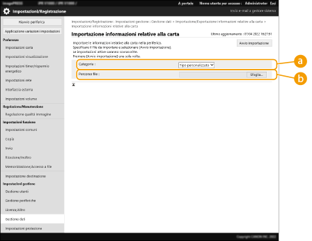 3 | Configurare le impostazioni necessarie. ![]() [Categoria]Selezionare le informazioni sull'impostazione della carta. [Percorso file]Fare clic su [Sfoglia...] e specificare il file da importare. |