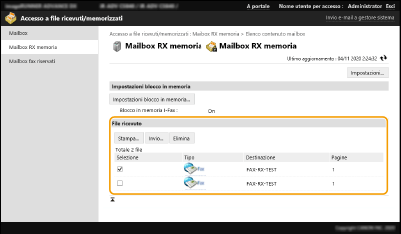 ![]() | È possibile utilizzare la IU remota per stampare, inviare o eliminare i file che sono stati memorizzati nella Mailbox, oppure I-fax che sono momentaneamente memorizzati nella Mailbox I-Fax. |