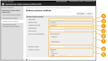 È possibile inviare una richiesta di emissione del certificato richiesto per le chiavi generate con la macchina a un server SCEP (Simple Certificate Enrollment Protocol), che gestisce i certificati. I certificati emessi dal server SCEP vengono automaticamente registrati sulla macchina. Per inviare una richiesta di emissione di un certificato sono necessari i privilegi di Administrator.