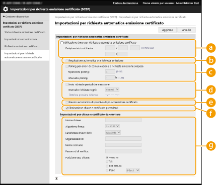 [Polling per errori di comunicazione o richiesta emissione sospesa]Selezionare questa opzione per controllare lo stato del server SCEP quando si è verificato un errore di comunicazione o una richiesta di emissione di un certificato è in sospeso. Specificare il numero e l'intervallo di polling.