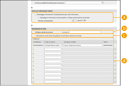 [Stringa di caratteri] | Inserire la stringa di caratteri registrata nell'attributo specificato in [Attributo utente da cercare:]. Per impostare i privilegi basati sul gruppo a cui appartiene l'utente, inserire il nome del gruppo. |