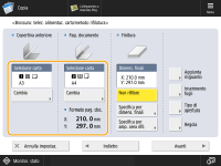 2 | Selezionare le impostazione di copia in <Risguardo anteriore> e <Risguardo posteriore> premere <OK>.Se non si desidera copiare sul risguardo, premere <Lascia in bianco>. Se si alimenta carta per il risguardo da "Document Insertion Unit-R", selezionare <Lascia in bianco>. Per impostare la carta per il risguardo, premere <Cambia> per <Selezione carta> selezionare la fonte di alimentazione della carta premere <OK>. |