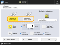 A seconda delle funzioni di finitura, è necessario installare dei dispositivi opzionali. Apparecchiature opzionali A causa del tipo di carta, non è possibile usare le funzioni di finitura. Specifiche hardware Quando si posiziona un originale sul vetro di letturaPremendo <Opzioni> <Creazione lavoro> sulla schermata delle funzioni di base per la copia è possibile usare la funzione Fascicolazione/Gruppo anche se l'originale viene posizionato sul vetro di lettura.Inserire un separatore di lavori tra ogni pagina durante l'uscita di un gruppoSe si seleziona <Raggruppam. (stesse pagg)>, è possibile inserire un separatore di lavori tra ciascun gruppo. Per ulteriori informazioni, vedere <Separatore lavori tra i gruppi>. <Separatore lavori tra i gruppi> Quando si configurano le impostazioni in <Accesso a file memorizzati>La funzione di finitura può essere utilizzata solo quando si stampa un file PDF/XPS o un file memorizzato nella Mailbox. |