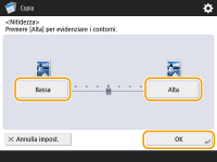 Premere <Alto> per regolare il livello in modo che il testo e le linee vengano copiati in modo nitido, oppure premere <Basso> per copiare i mezzitoni in modo più omogeneo nelle immagini stampate, ecc.