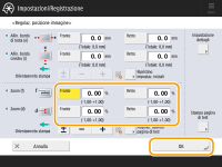È anche possibile eseguire la regolazione utilizzando il foglio guida o la pagina di prova. Quando si esegue la scansione con l'alimentatore Regolazione della posizione dell'immagine utilizzando la pagina di test (quando si utilizza un alimentatore) Durante la scansione con il vetro di lettura Regolazione della posizione dell'immagine utilizzando il foglio guida (Quando si utilizza il vetro di lettura) |