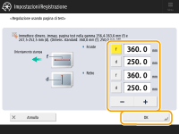 <f>: | Immettere la lunghezza misurata del segno 'f' sulla pagina di test. Per il foglio lungo: immettere il valore di inserimento calcolato dalla lunghezza misurata del segno 'f' sulla pagina di test del foglio lungo. Valore immesso = ((valore predefinito 'f': 360 mm)/posizione misurata 'f': 450, 550, 650 mm)) x valore misurato 'f' |