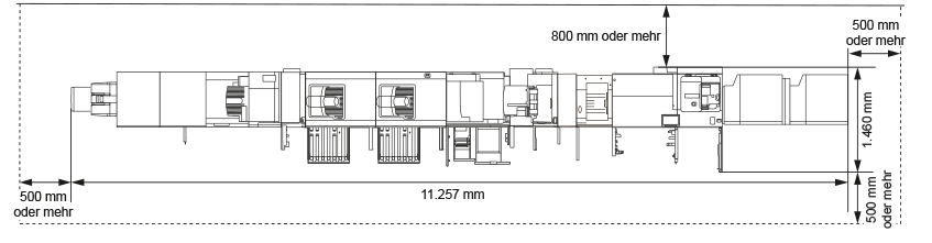 Stapelablage J | 899 mm x 745 mm (1.250 mm*) x 1.141 mm (bis zur Oberseite des oberen Fachs) *Wenn das Auswurffach aus dem Stapler herausgezogen wird. | Ca. 120 kg |